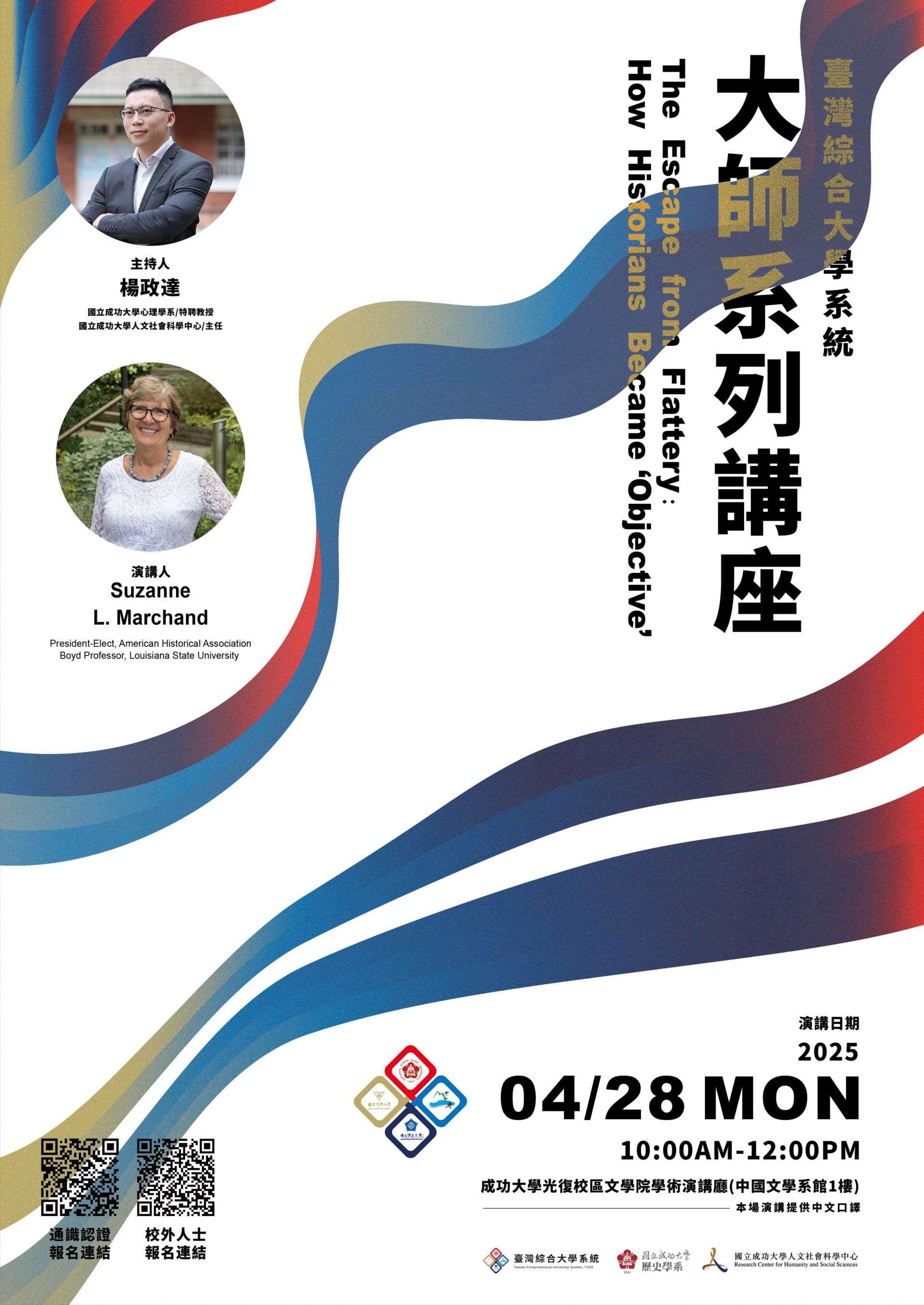 Master Lecture of TCUS: Professor Suzanne Marchand Title:The Escape from Flattery:How Historians Became‘Objective’ Speaker:Professor Suzanne Marchand Moderator: Cheng-Ta Yang / Director, CHASS NCKU Time:2025-4-28(Mon.)10:00-12:00 Location:Academic Lecture Hall @ NCKU KUANG-FU Campus, History & Goals College of Liberal Arts Language:English Registration:https://activity.ncku.edu.tw/index.php?c=apply&no=15969